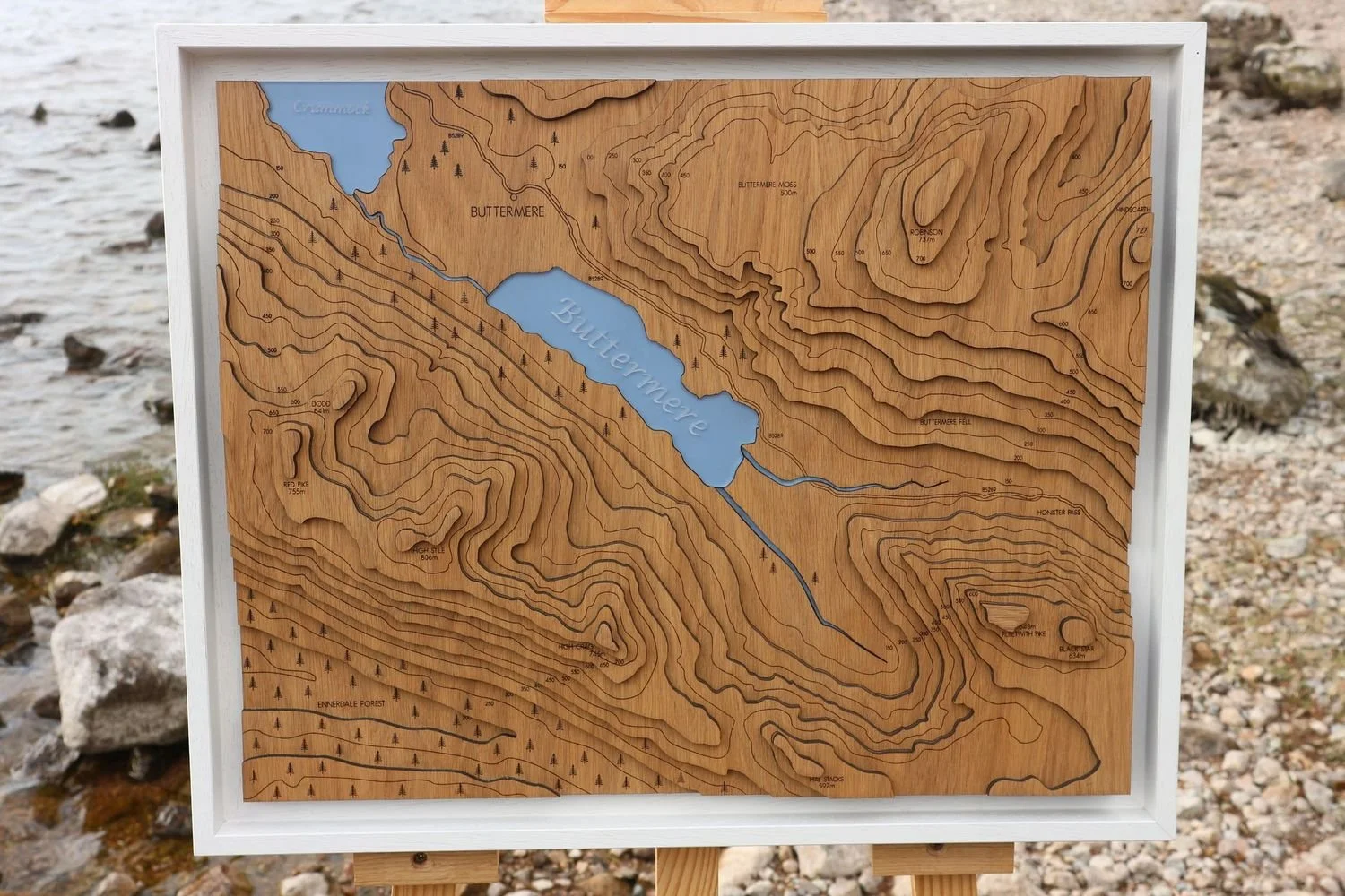 These decorative pictures are made using laser cut oak pieces for the land and laser cut acrylic for the lake. The wood is then layered together to create these unique topography landscapes