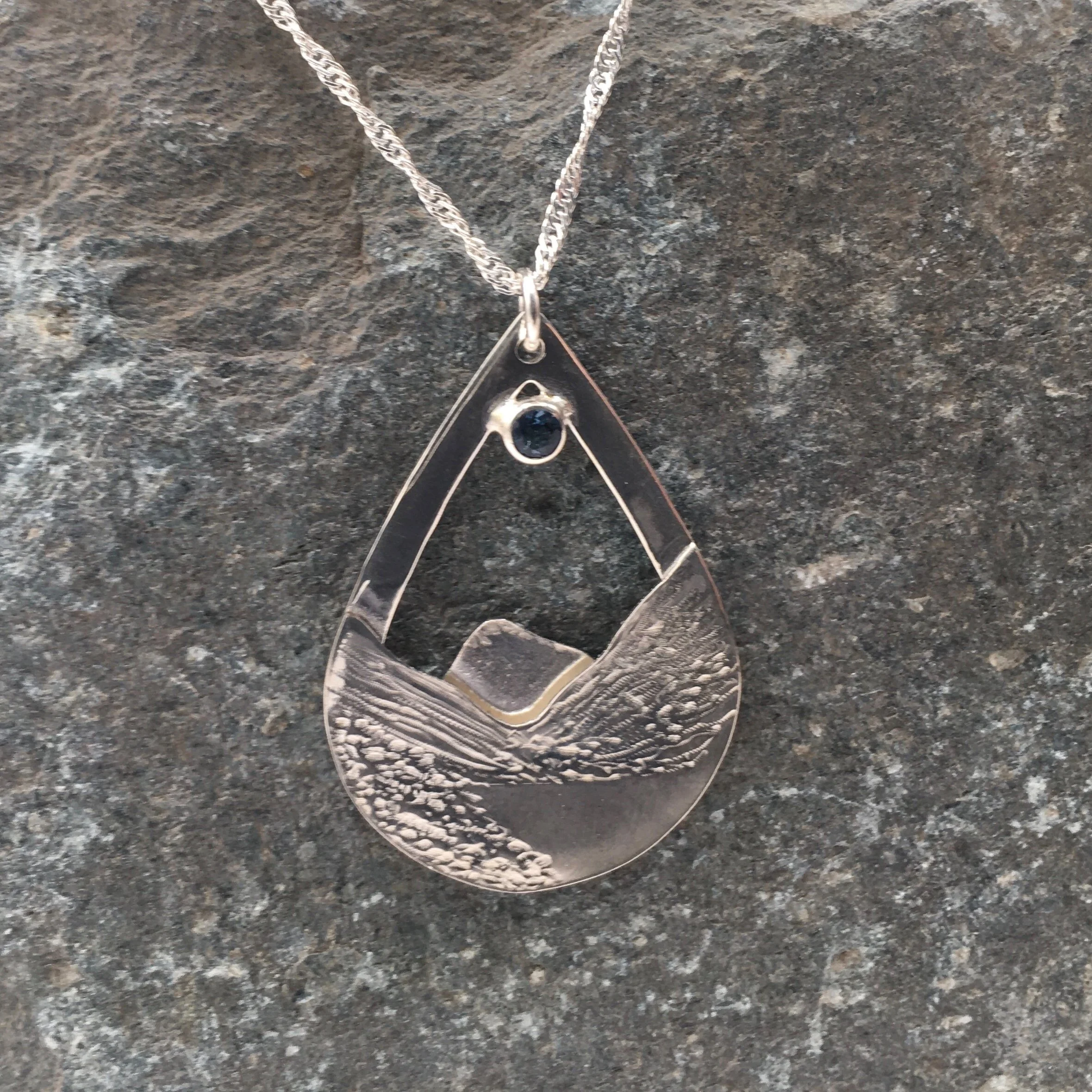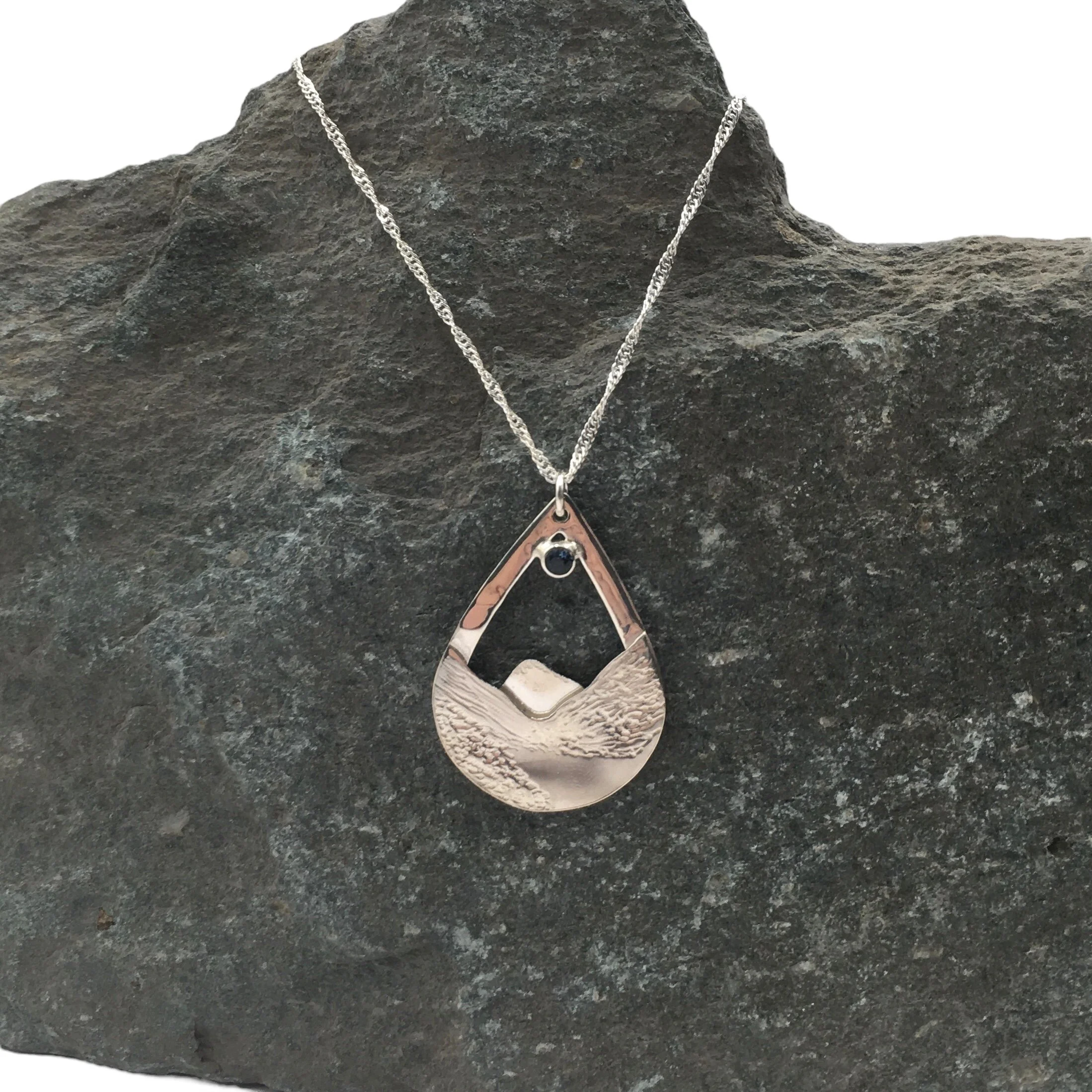 A textured silver pendant capturing the layered curves and gentle contours of the surrounding fells above Buttermere, handmade by Tessa Quail in Keswick.
