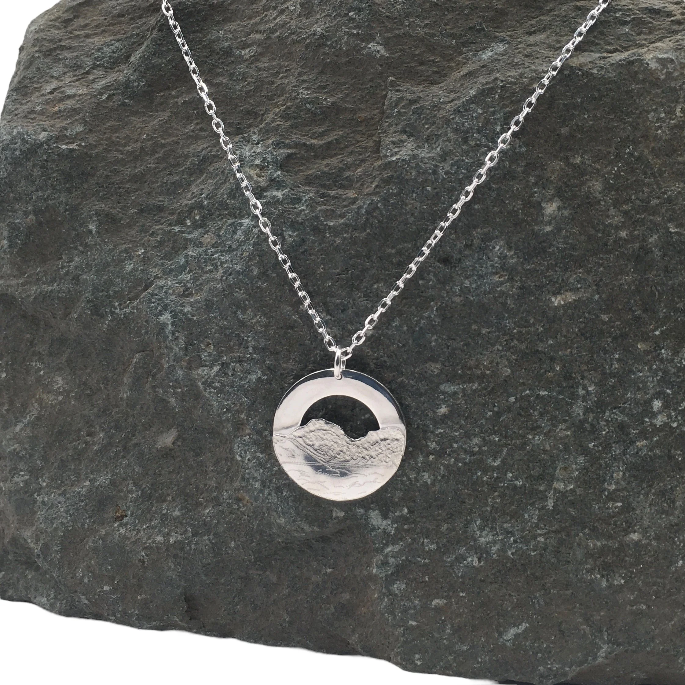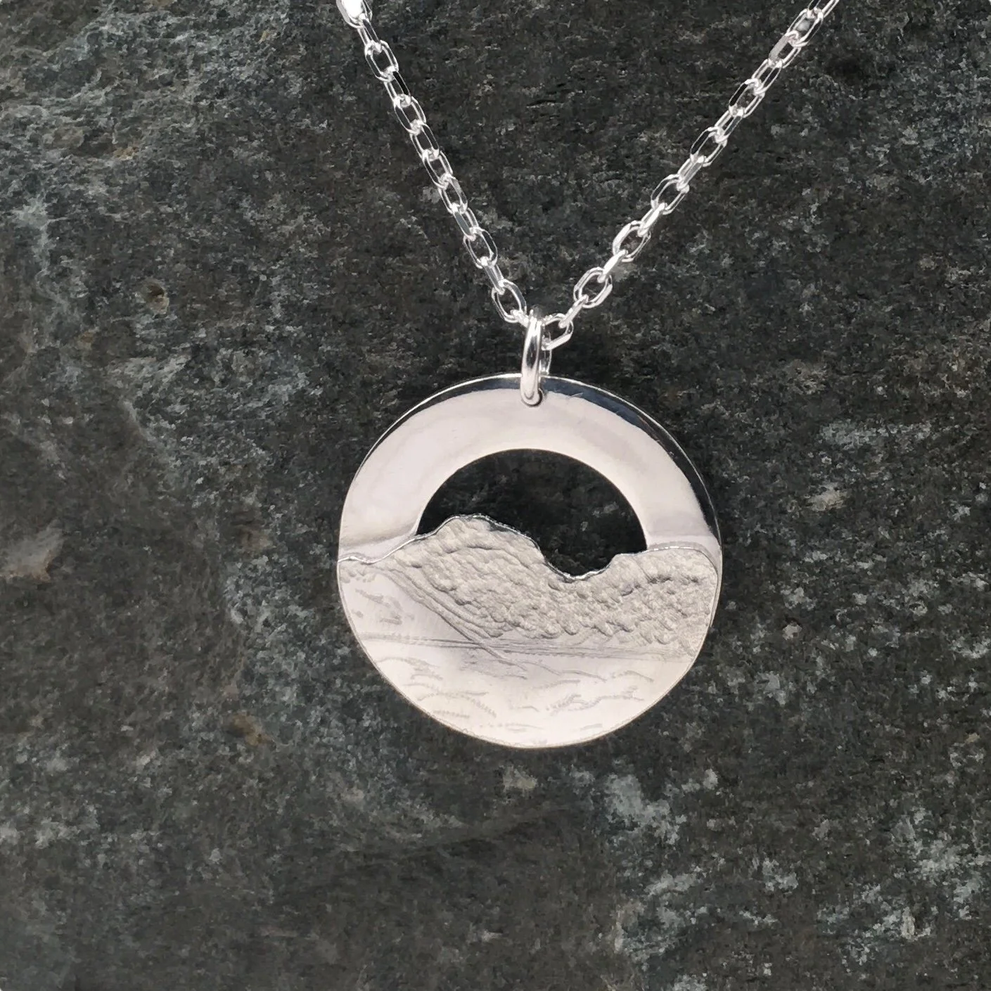 A handcrafted silver pendant by Lake District Jeweller Tessa Quail, inspired by the strong outline and sweeping form of Skiddaw. One of the Lake Districts most iconic peaks.